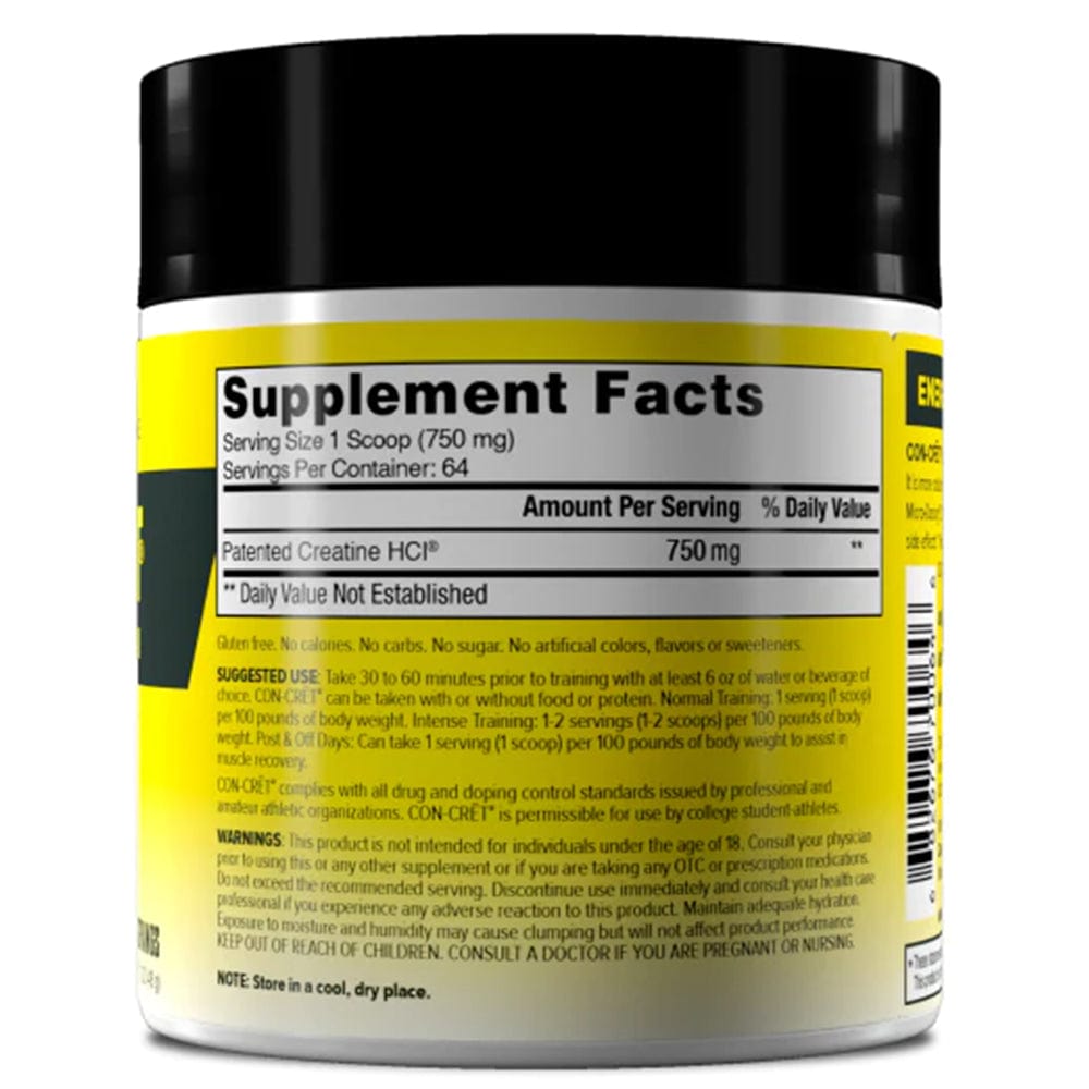 CON-CRET Patented Creatine HCL Powder: The #1 stimulant-free pre workout supplement and the #1 bioavailable creatine. CON-CRĒT ® Patented Creatine HCl is the only Micro-Dosing creatine. All the strength and endurance benefits of creatine, without any of the negative side effects common to other creatines. With CON-CRĒT ®, there is no bloating, upset stomach, or water retention, when used as directed*. Our bodies make about half of the creatine we need, and the rest must come from foods or supplements. Clinical studies confirm your body needs creatine to fuel your muscles, brain, immune system…every cell in your body! The capsules provide a convenient 1-2 capsules per day dosing. Pairs perfectly with protein, stimulant pre-workout, and weight loss supplements.