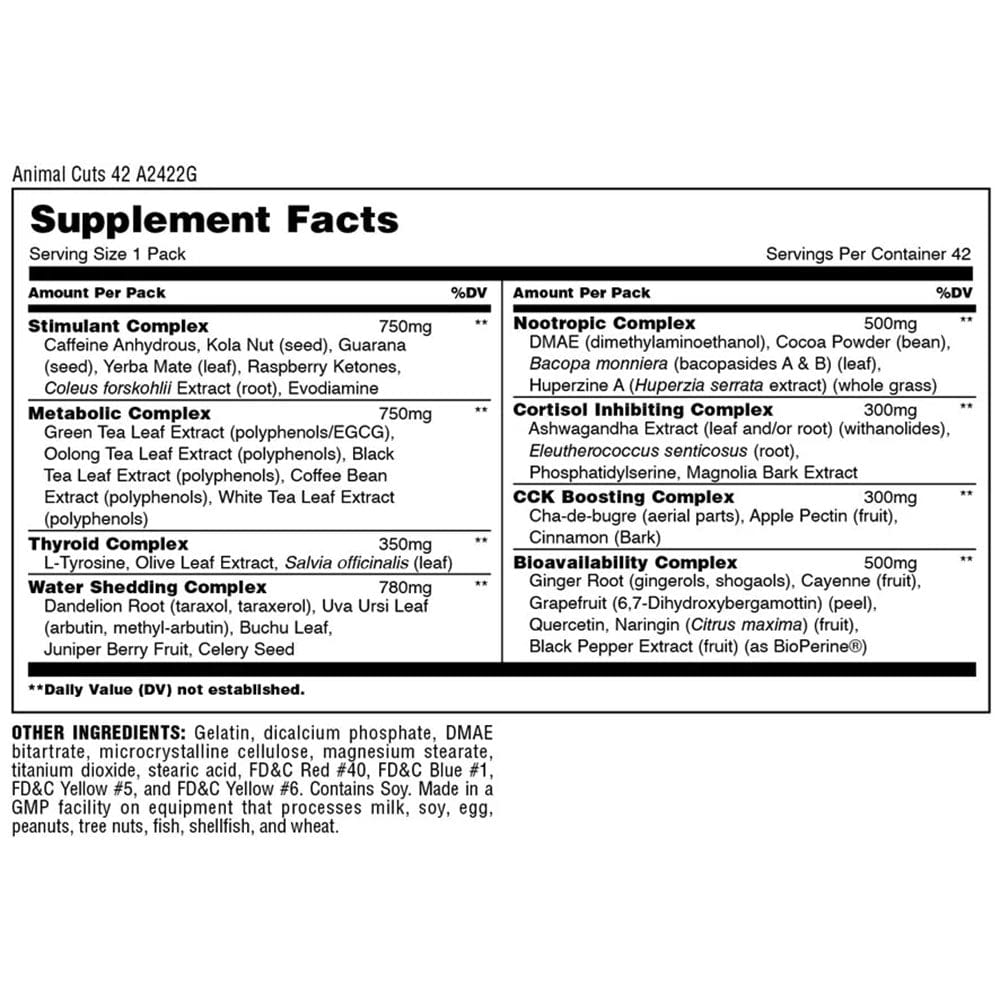 Animal Cuts is a complete and comprehensive fat shredding formula designed to get you sliced, diced and shredded! Each convenient pack delivers over 40 active ingredients, with nearly 8,500 milligrams of pure fat shredding power. It is made up of eight distinct components: Thermogenic Complex, Metabolic Complex, Diuretic Complex, Thyroid Complex, Nootropic Complex, Cortisol Inhibiting Complex, CCK Boosting Complex and Bioavailability Complex.