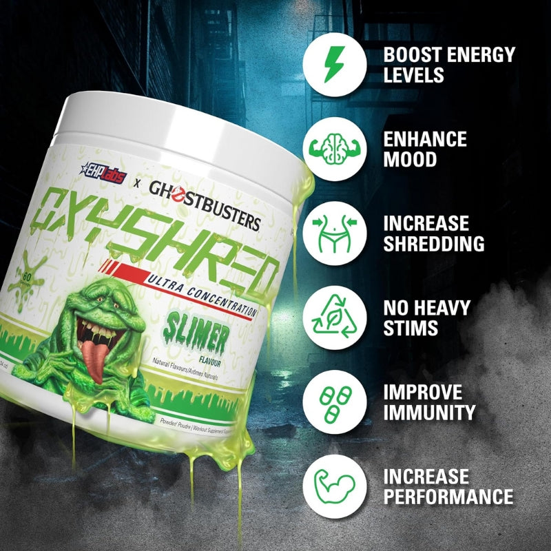 EHP Labs X Ghostbusters Limited Edition Oxyshred Thermogenic Fat Burner Powder available in Slimer and Proton Plasma.