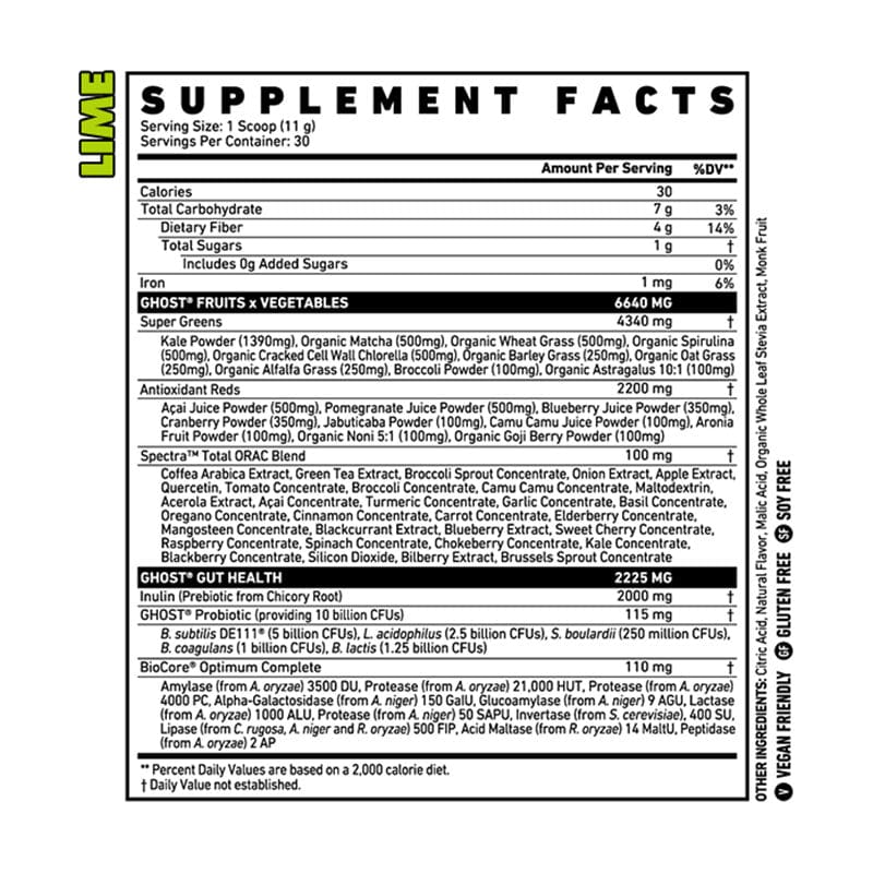 GHOST® Full Disclosure Label: 6.5G Total Greens & Reds, 100mg Spectra™, 2G Inulin Prebiotic Fiber, 10 Billion CFU GHOST® Probiotic, BioCore® Optimum Complete Digestive Enzymes.