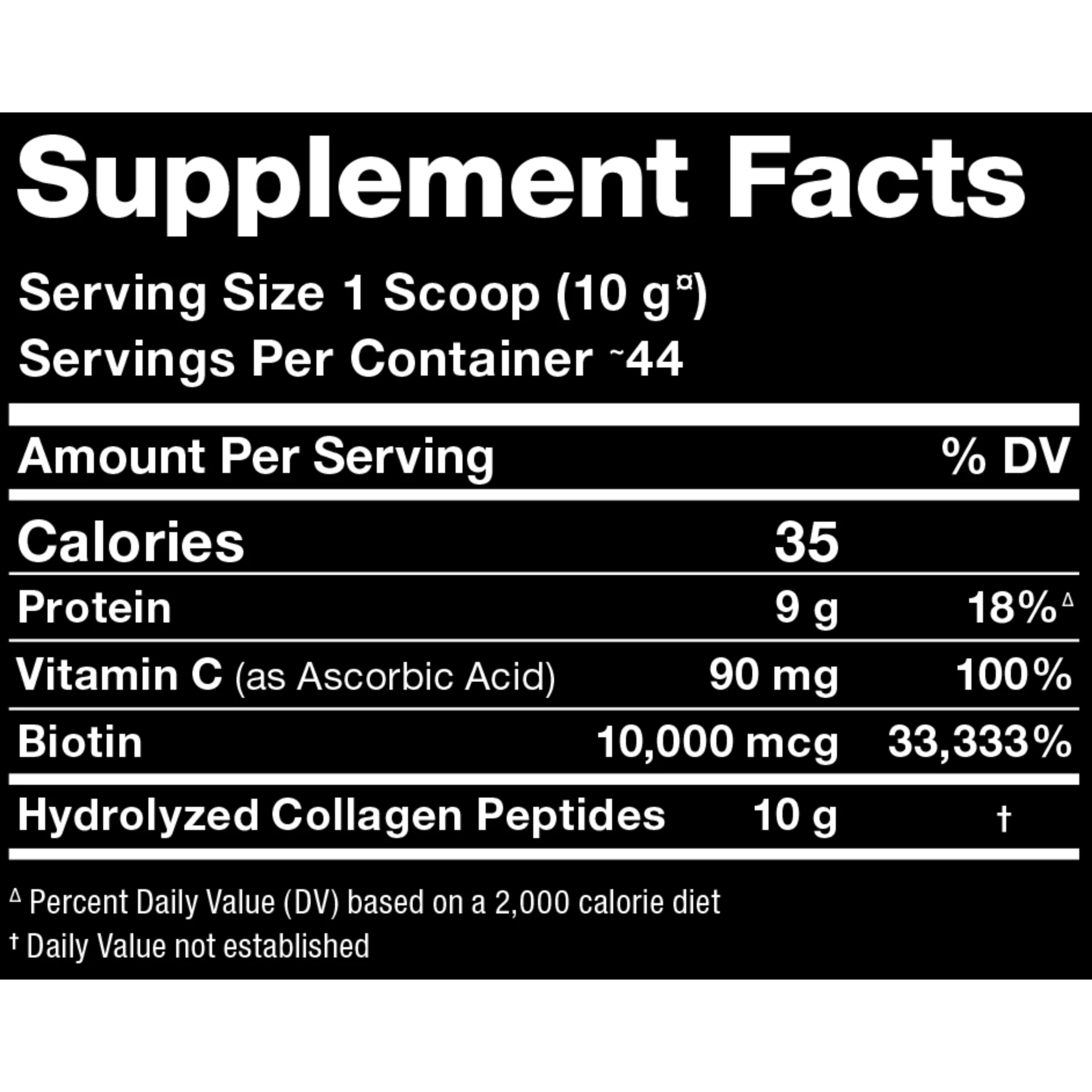 REPAIR Collagen is vital in maintaining good joint and connective tissue health. Collagen can also aid in strengthening your bones. The addition of Vitamin C helps repair tissue and maintain bones and joints. Biotin promotes skin, hair and nail strength.*