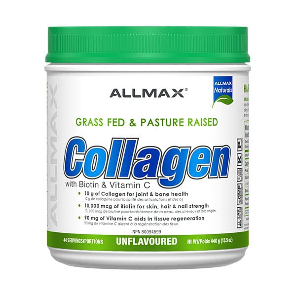 Allmax Nutrition Collagen with Biotin & Vitamin C is sourced from grass fed and pasture raised cows. Every scoop contains 9 grams of protein, 90 mg of vitamin c, and is designed to support bones, hair, nails & skin.