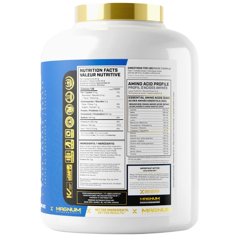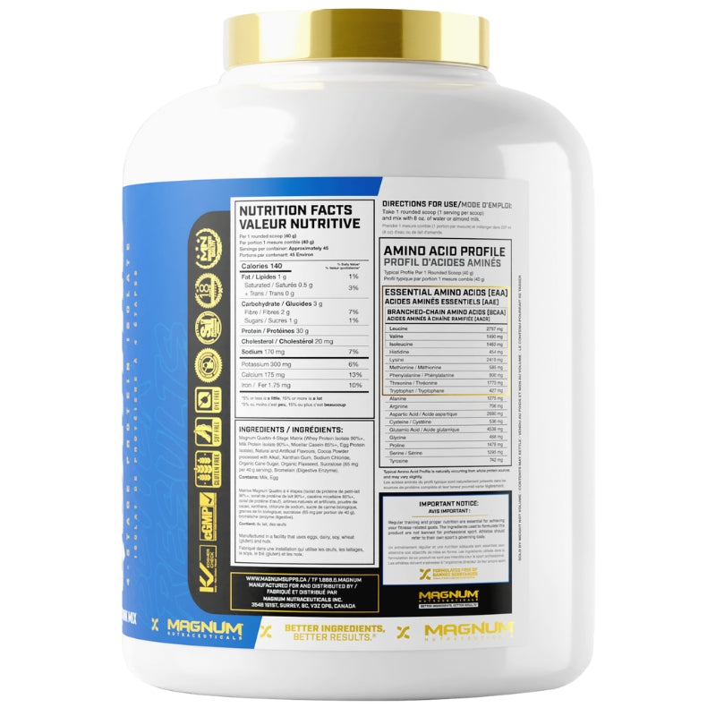 Magnum Quattro is a 4 isolate, time-released, smooth digesting protein. With no lactose and a combination of 4 high-quality isolates, essential fats like flaxseed, Magnum Quattro is the great-tasting protein you have been waiting for!*