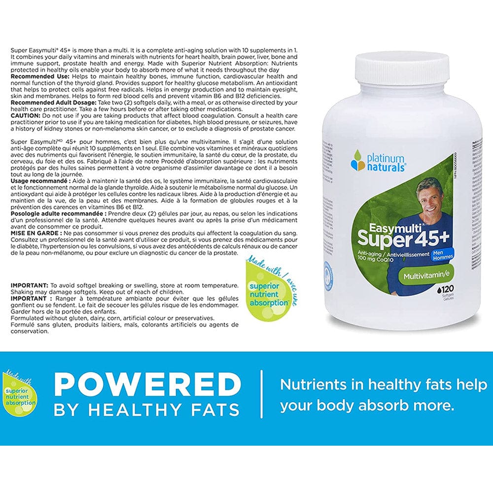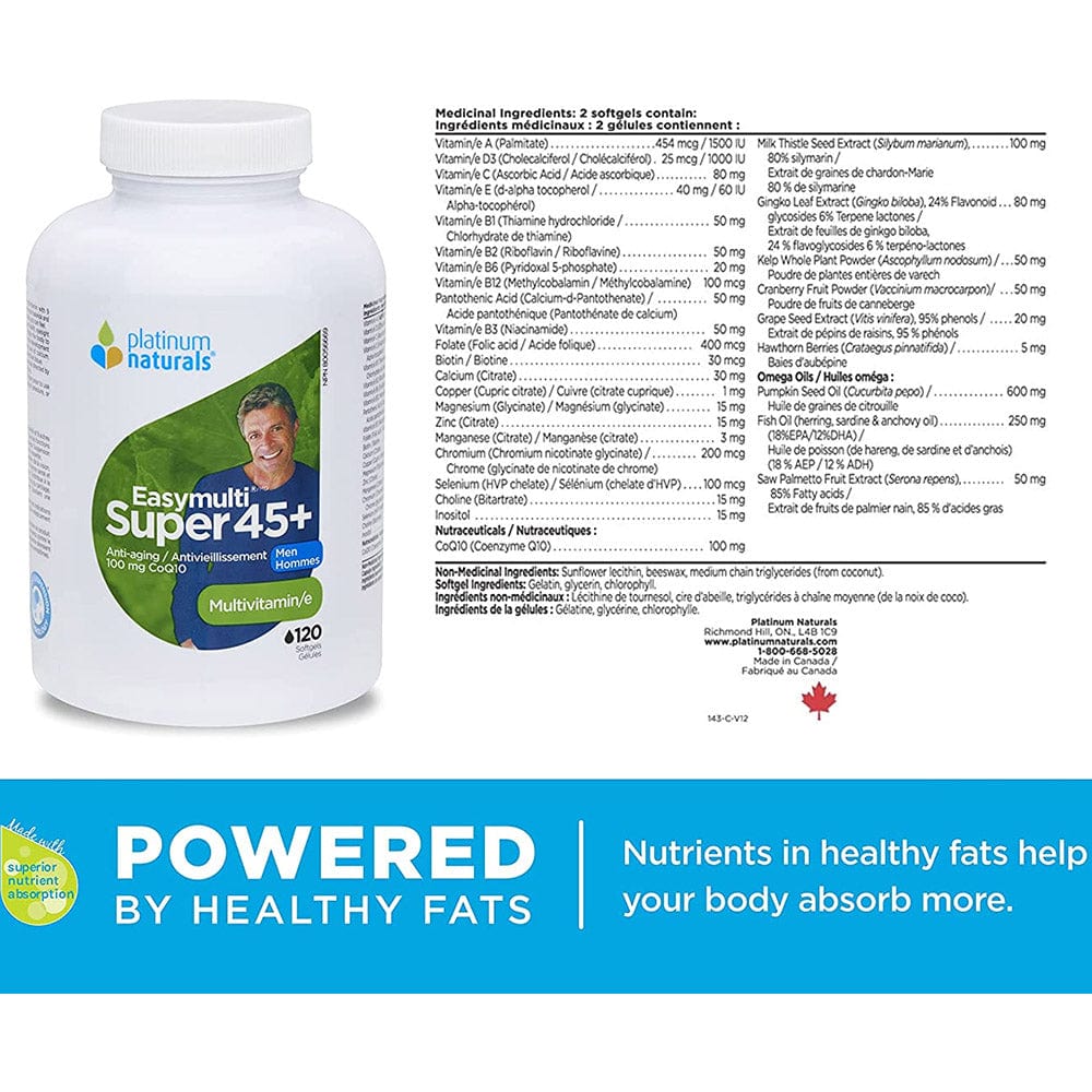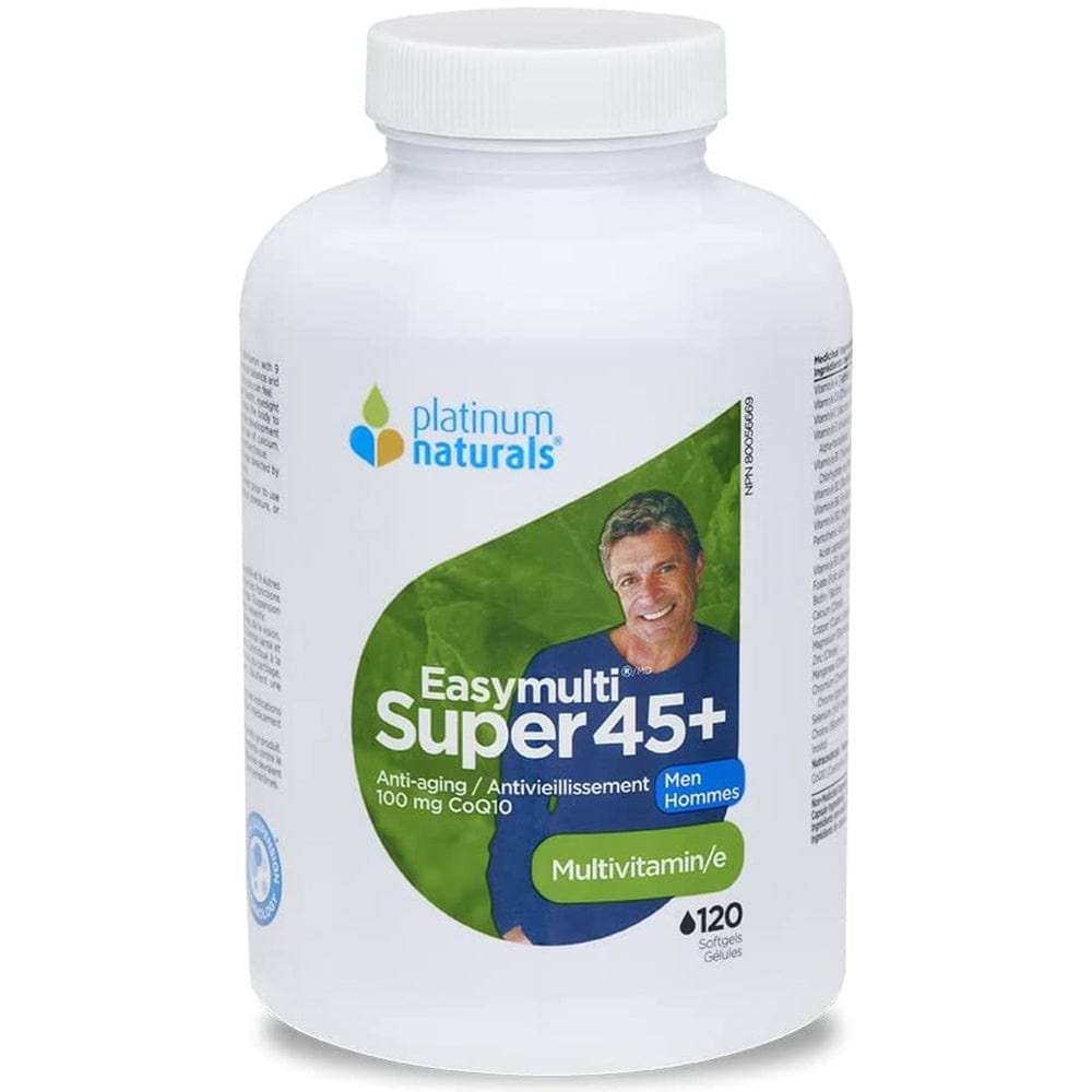 Over time, cell degeneration from free radicals can lead to diminished eyesight, hearing and memory. It can also impair your immune system and lower your resistance to illness and infection. Platinum Naturals EasyMulti Super 45+ for Men, 120 softgels is designed to fight against internal and external signs of aging through its unique formulation of vitamins, minerals, traditional herbal therapies and antioxidants.