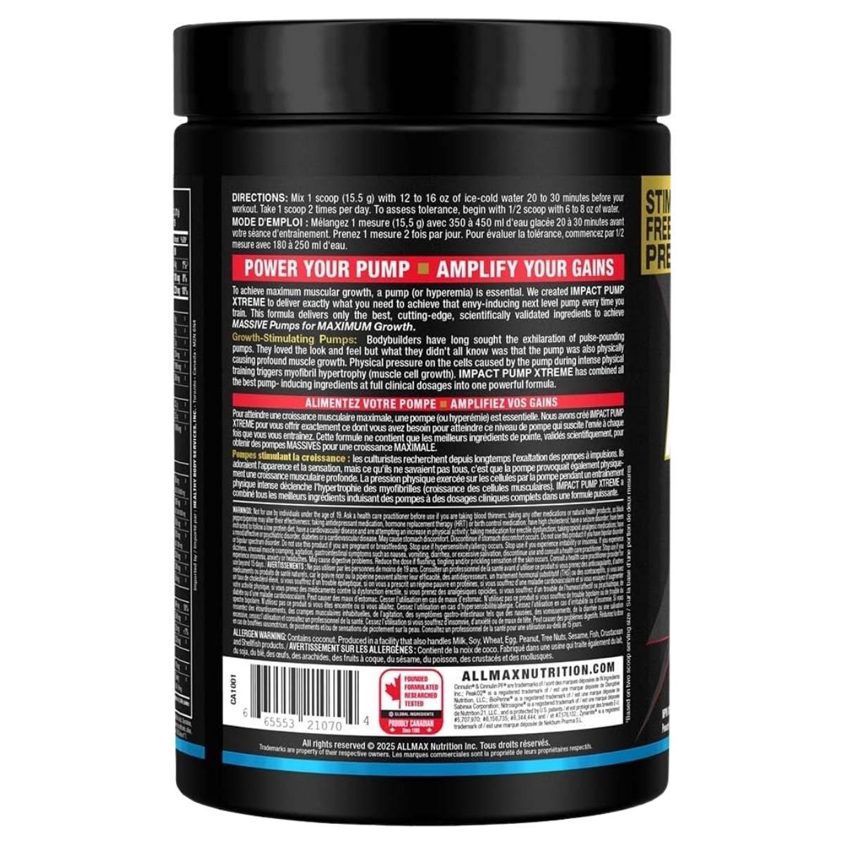 Allmax Nutrition Impact Pump Xtreme is a stimulant-free pre-workout supplement designed to enhance muscle pumps, increase strength, and improve mental focus during workouts. It is suitable for athletes and fitness enthusiasts who want to maximize performance without the use of caffeine.